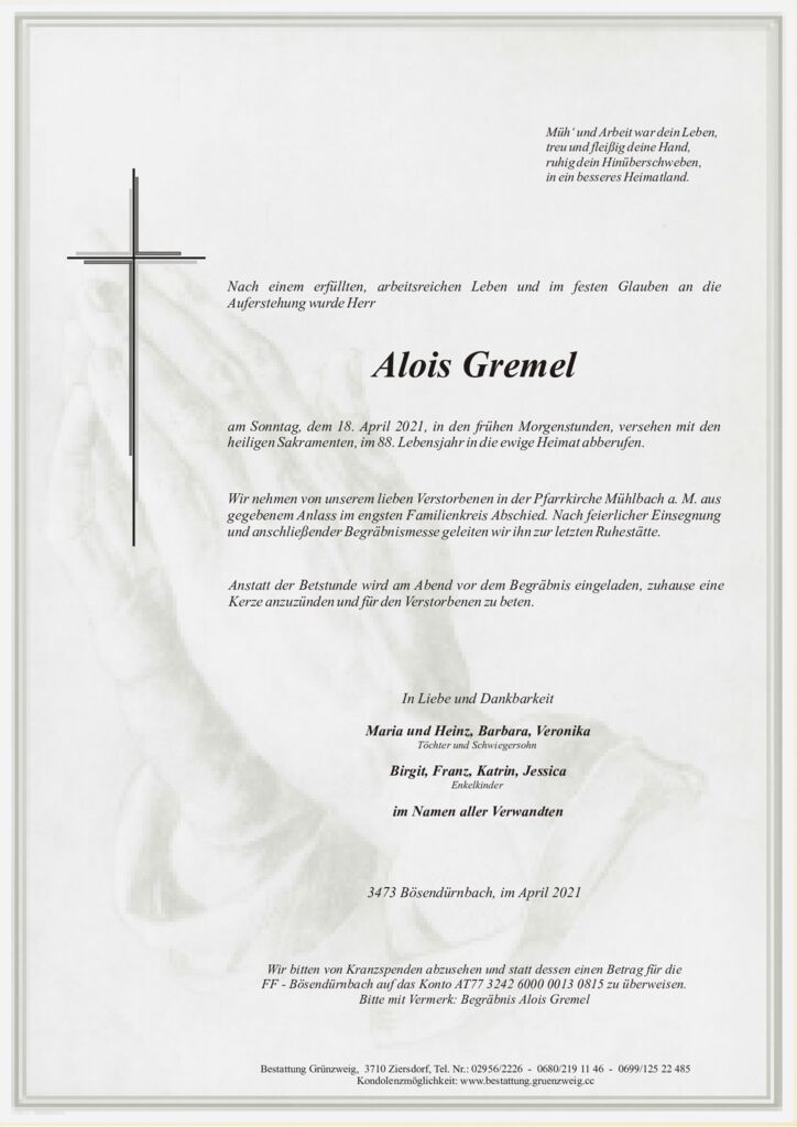 Unsere aufrichtige Anteilnahme der Trauerfamilie! Ein fester Bestandteil unserer kleinen feinen Ortsgemeinschaft ist nicht mehr. Er möge in Frieden ruhen! Sonja Salzbauer u. Familie u. Juli Salzbauer
