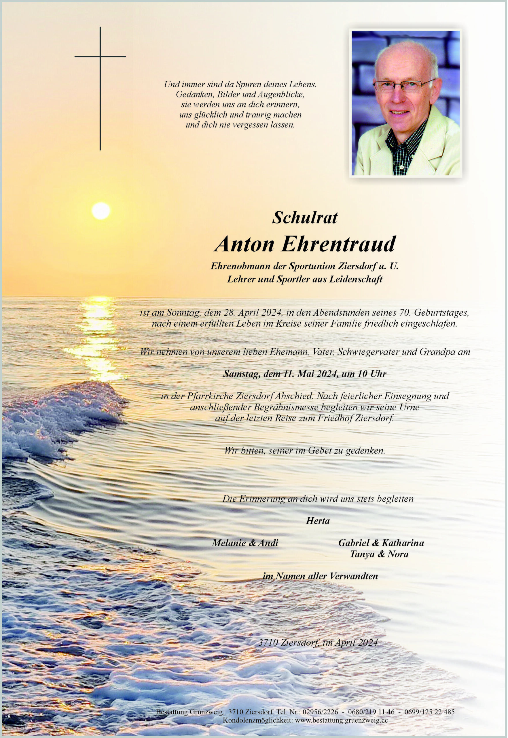 Liebe Trauerfamilie, bestürzt habe ich von Herrn Ehrentrauds Tod erfahren und möchte mein herzliches Beileid der Familie und Freunden ausdrücken. Herr Ehrentraud war mein Lehrer in der Hauptschule Ziersdorf und ich denke immer gerne an den Unterricht und den Skikurs zurück.