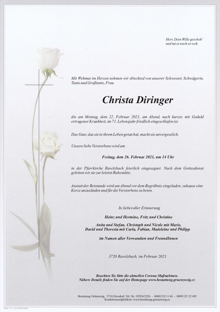 Christa und ich waren über viele Jahre die besten Freundinnen. Sie war auch die Taufpatin meiner Tochter Barbara. Wir beide haben unglaublich schöne Erinnerungen an diese Zeit. Leider habe ich nie erfahren warum sie unsere Freundschaft beendet hat. Wie auch immer ich bin sehr betroffen von Ihrem Tod und möchte der ganzen Familie auf diesem Weg mein Beileid aussprechen. Ich werde nur die schöne Zeit mit ihr in meiner Erinnerung bewahren.