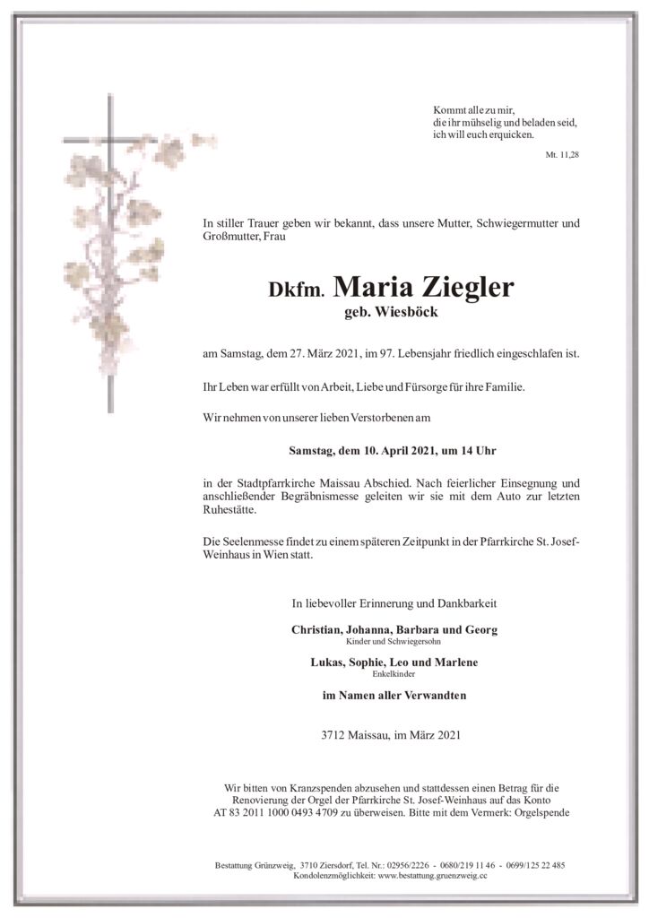 Innigste Anteilnahme am Tod von Maria Ziegler entbietet der gesamten Trauerfamilie Otto Thiemer