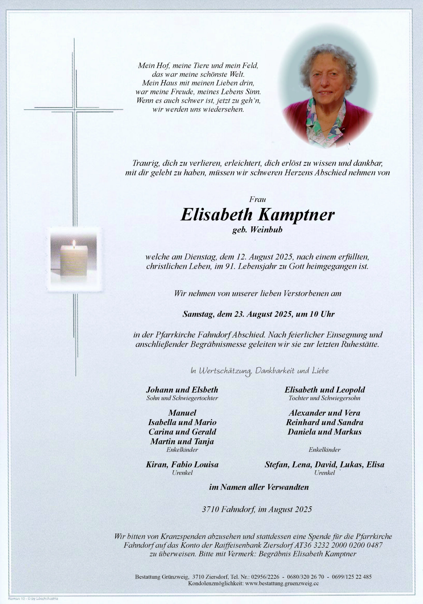 Liebe Familie Kamptner! Das einzig Wichtige im Leben sind die Spuren der Liebe, die wir hinterlassen, wenn wir gehen! Unser aufrichtiges Beileid erbietet Familie Prock