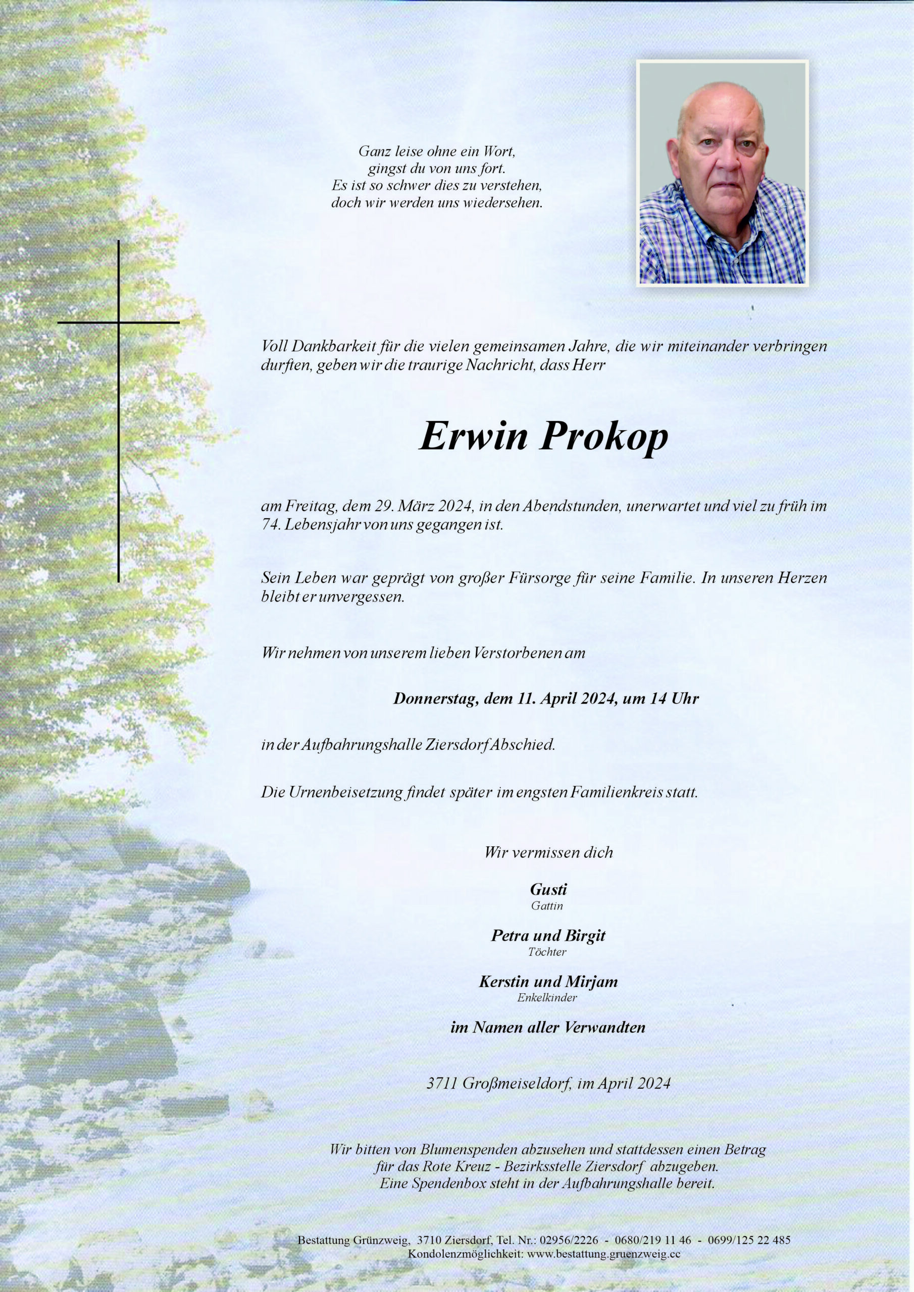 S.g.Fam.Prokop. Zu Ihrem schmerzl.Verlust möchten wir unser herzliches Beileid aussprechen.Renate Rzehak samt Fam.(Birkenweg 4)