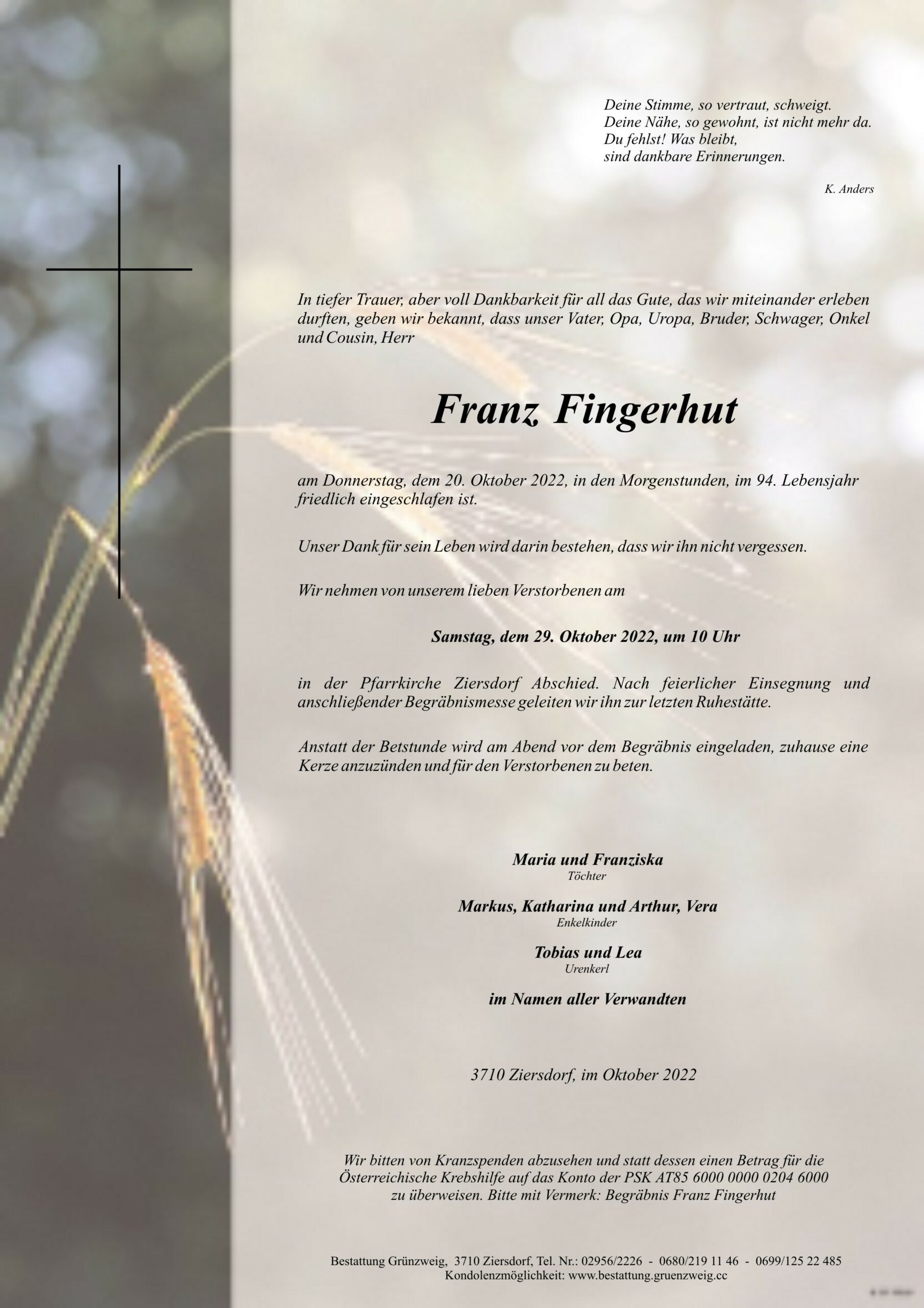 Mit großer Betroffenheit entnahm ich der Zeitung die Todesnachricht. Mit Franz Fingerhut ist ein großer Ziersdorfer von uns gegangen, der hier viele Spuren hinterlassen hat. Ich bin dankbar, dass ich viele Jahre mit ihm zusammenarbeiten durfte – wir waren Weggefährten im Dienste der Hauptschule Ziersdorf und ihrer Gestaltung und Entwicklung. Dabei erlebte ich ihn als freundlichen, aufgeschlossenen, initiativen, engagierten, lösungsorientierten zielstrebigen und kooperativen Kämpfer für „seine Schule“. So werde ich den langjährigen Obmann der Hauptschulgemeinde Ziersdorf in Erinnerung behalten und sage ihm als damaliger Direktor hier ein letztes „Dankeschön“ für seine Mühe und seinen Einsatz.