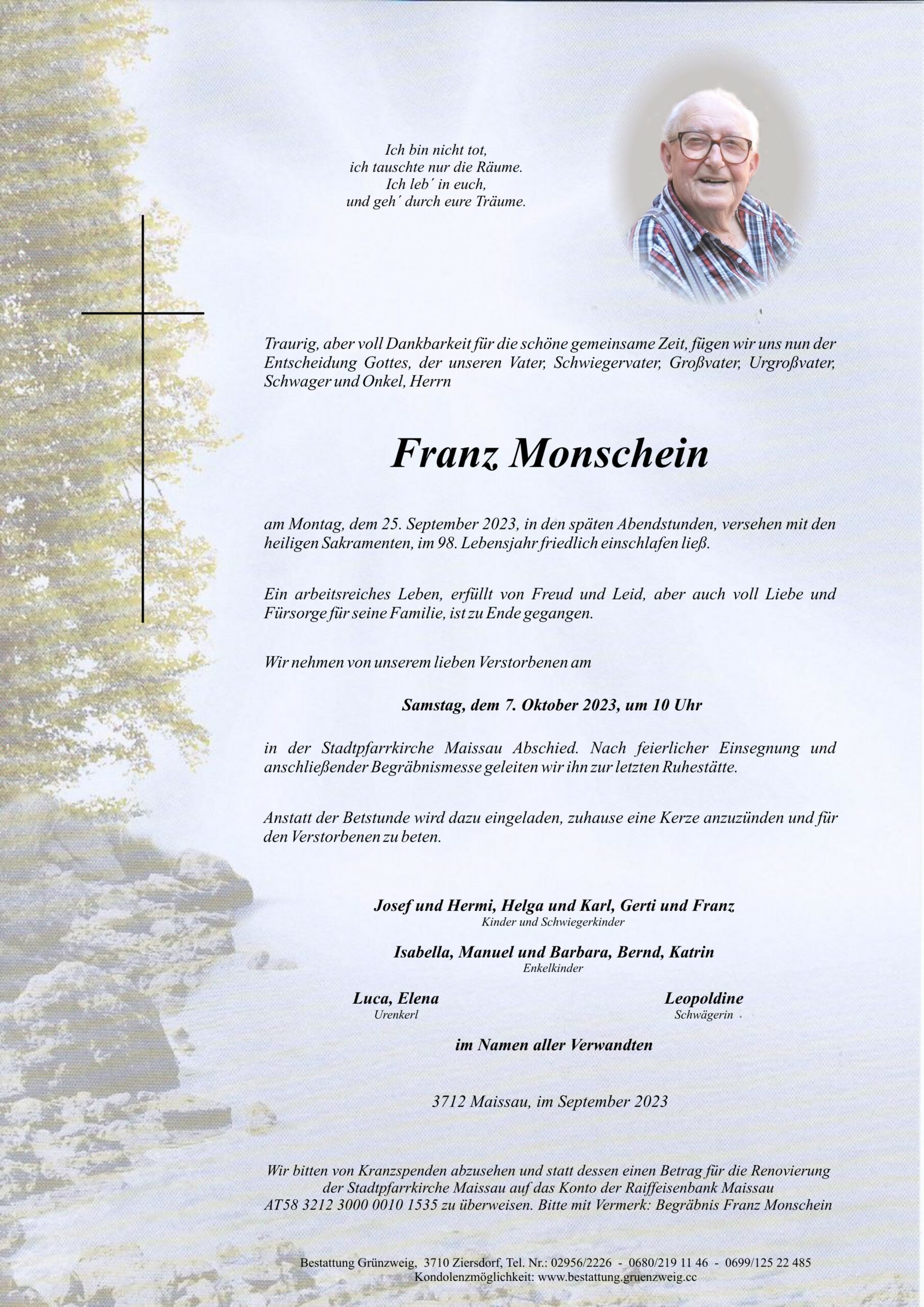 Unsere Anteilnahme am Tod von Herrn Monschein möchten wir hiemit zum Ausdruck bringen. Fam. Keusch