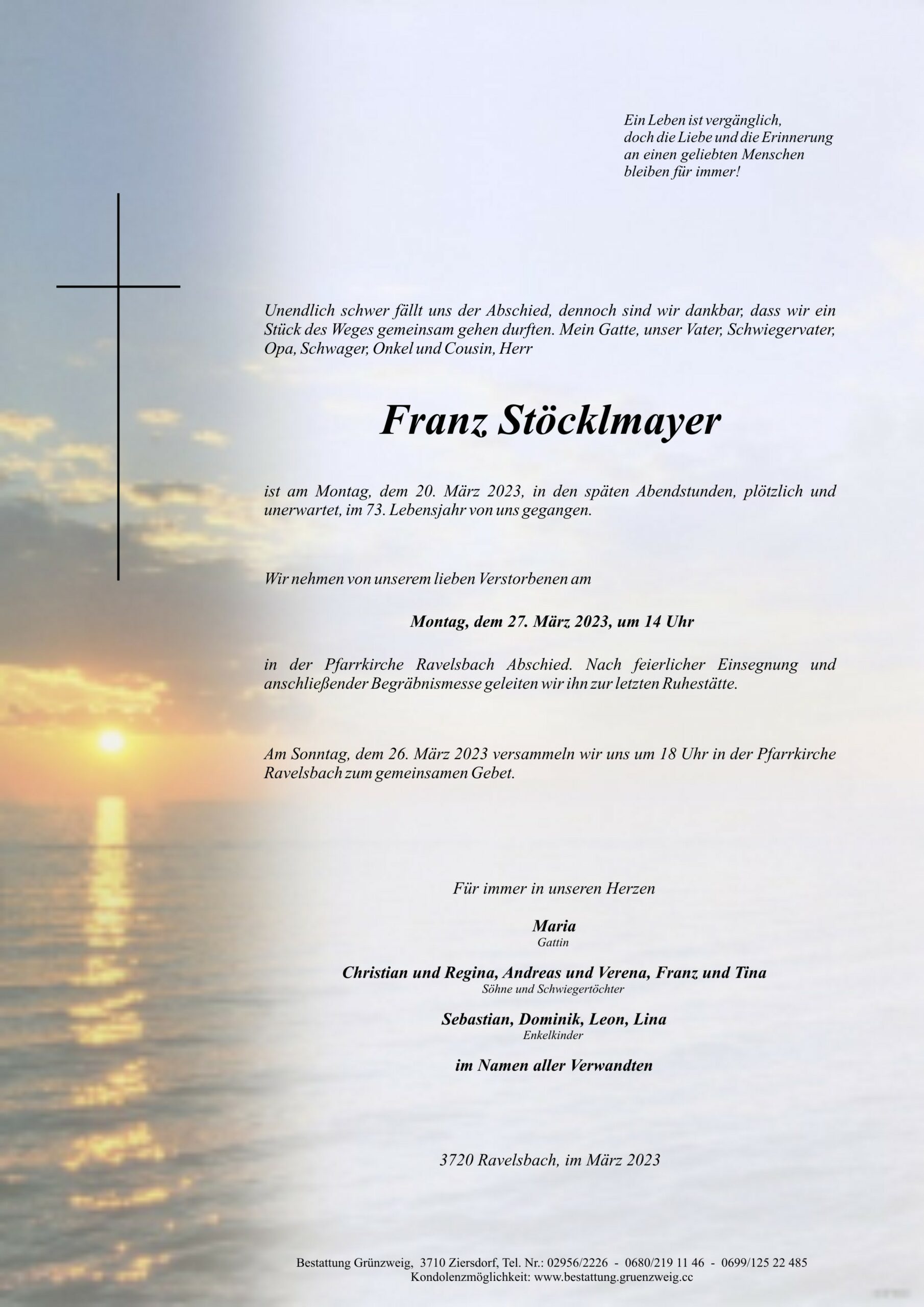 Werte Trauerfamilie, fassungslos über das Ableben von Franz, entbiete ich meine aufrichtige Anteilnahme.