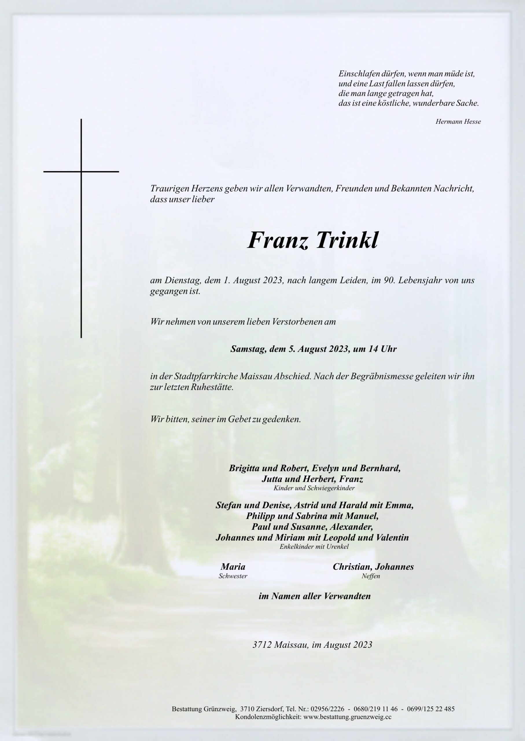 Unsere aufrichtige Anteilnahme am Ableben von Herrn Trinkl entbietet Fam. Keusch O.D.