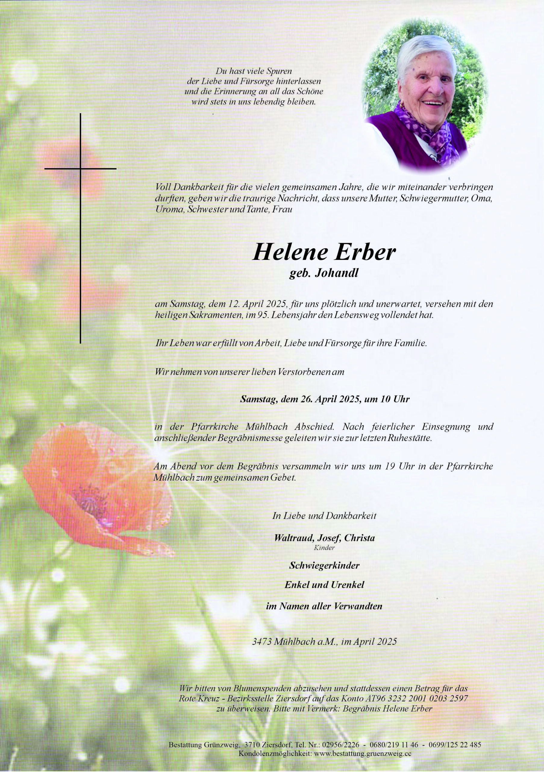 Meine liebste Mama! Dein ungeahnter Abschied hat mich betroffen und sehr traurig gemacht. Niemand weiß, wann sie (er) heimgeholt wird…..Trotz tiefer Traurigkeit bin ich Dir dankbar für das Leben, das Du mir geschenkt hast und wir es ein großes Stück weit hier teilen durften. Ebenso dankbar bin ich für die große Gnade, die Dir Zuteil wurde, indem Dich der Herr, ohne leiden zu müssen, aus „heiterem Himmel“ zu sich rief. Darum “ Ruhe in Frieden!“ In Liebe und Dankbarkeit, Deine erstgeborene Tochter Waltraude Liebe Christa, lieber Josef, zutiefst fühle ich mit Euch! Wieviel größer muss Euer Schmerz über den Verlust unserer Mama sein, weil Ihr beide das Privileg hattet mit Mama ihr ganzes Leben lang, Seite an Seite zu sein. Möge Dankbarkeit Eure Traurigkeit heilen, Eure Schwester