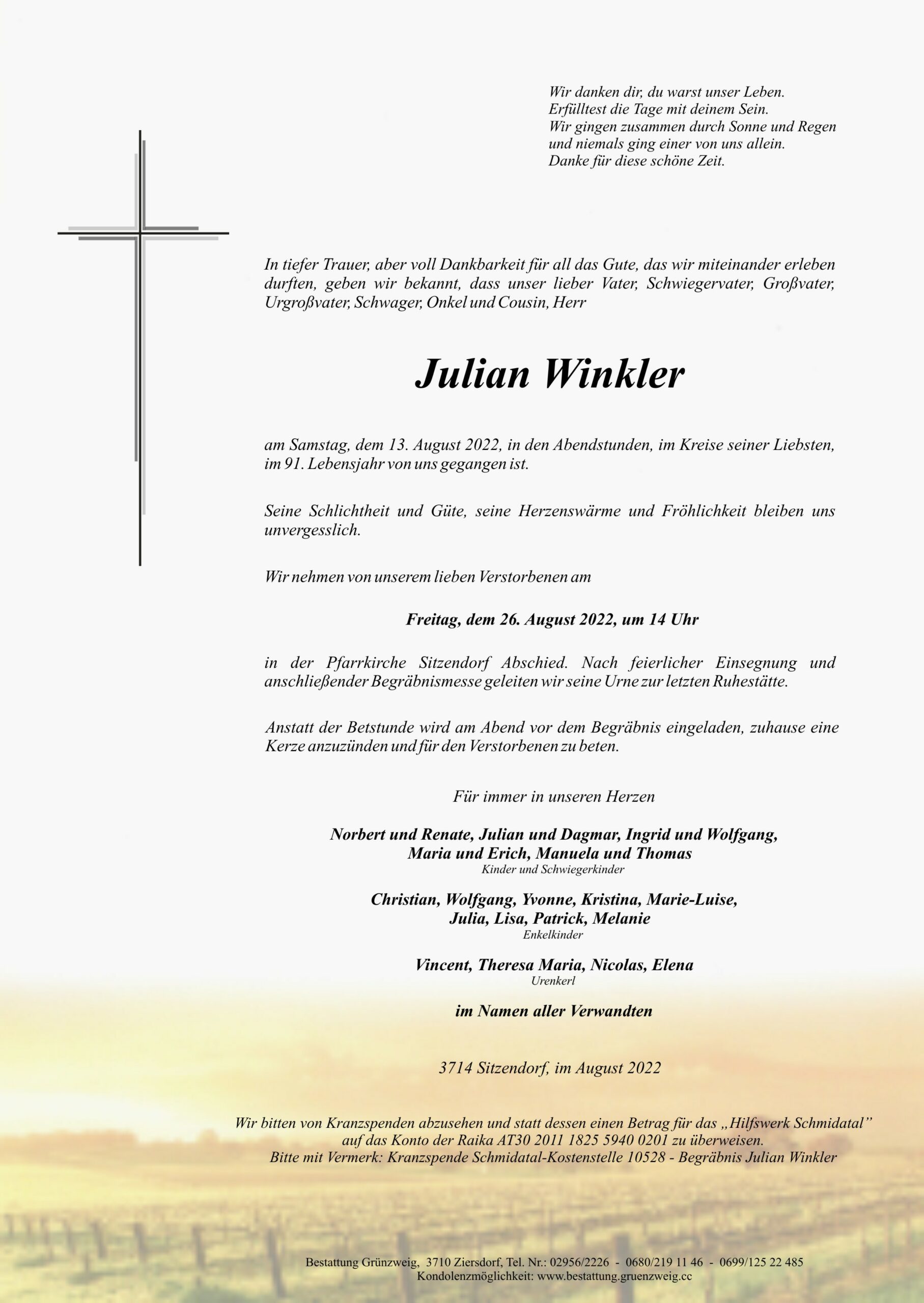 Liebe Trauerfamilie! Wir möchten Euch allen unser aufrichtiges Beileid und Mitgefühl zu eurem schweren Verlust ausdrücken. Onkel Julian war ein liebenswerter Mensch, wir werden ihn sehr vermissen. Herzliche Grüße Familie Gabi und Sepp Mühlbacher