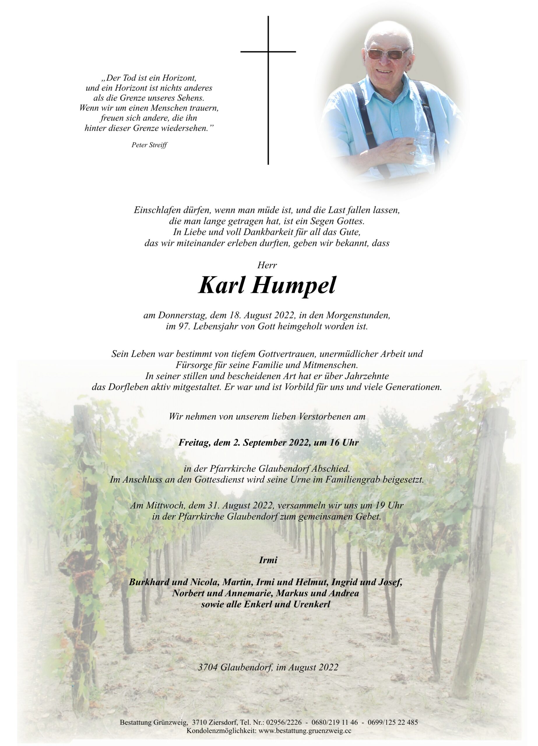 Liebe Familie Humpel, wir entbieten unser aufrichtiges Beileid zum Ableben eures lieben Vaters und Großvaters. Familie Schörg