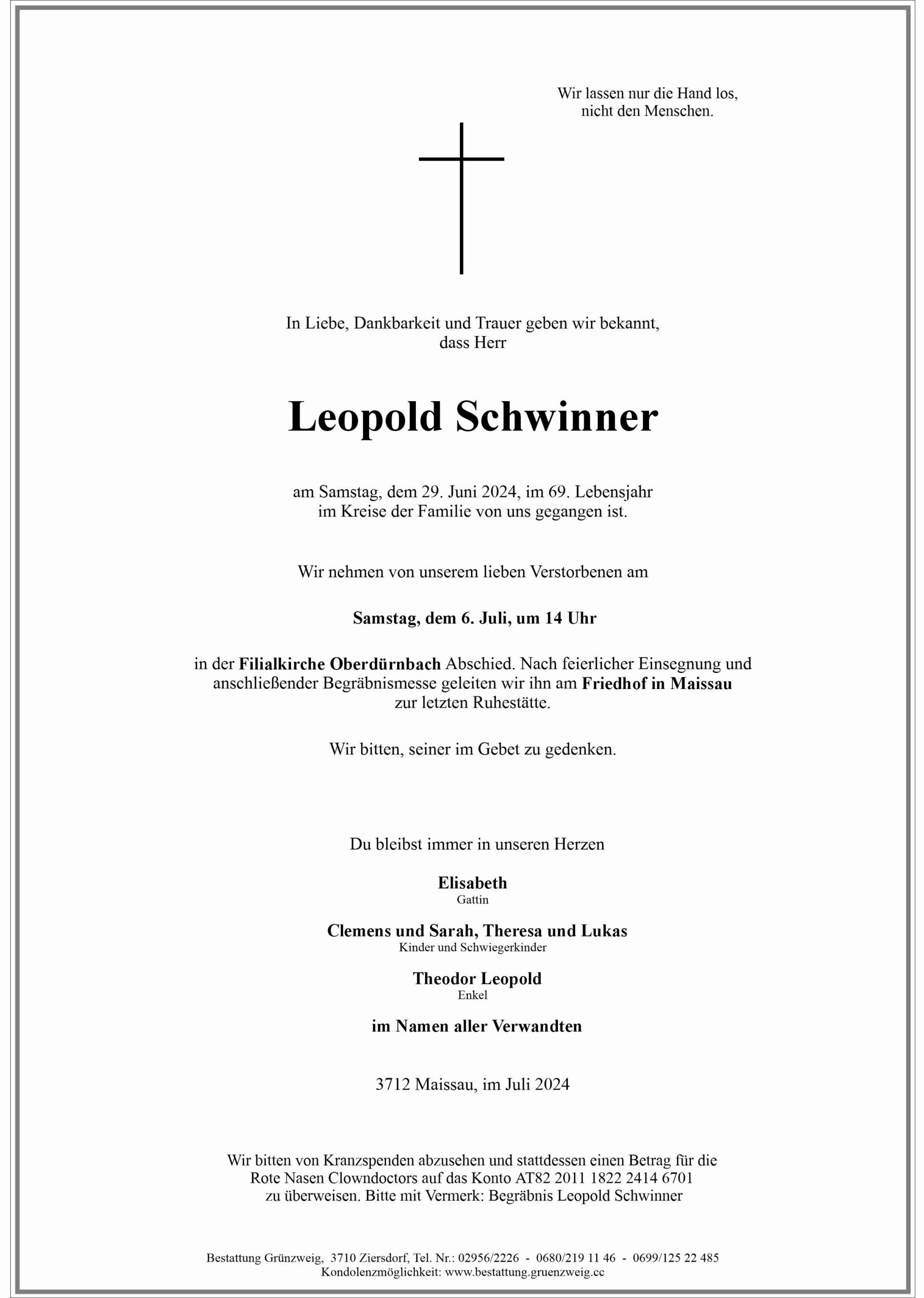 Liebe Familie Schwinner! Unser aufrichtiges Beileid zum Tod von Leopold. Sabine & Günter Rapp