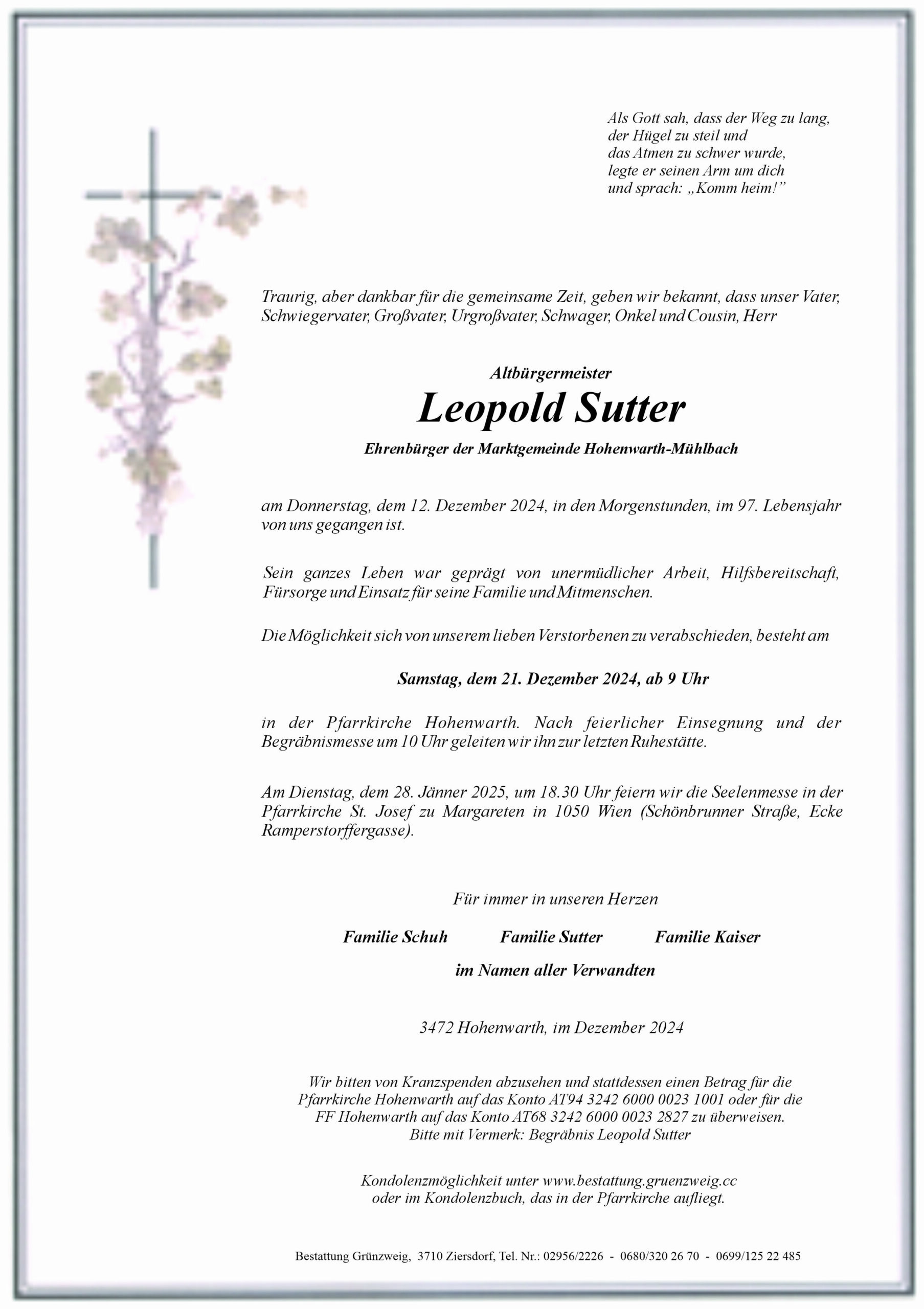 Aufrichtige Anteilnahme und tief empfundenes Mitgefühl entbieten Familie Paschinger und Schober. Herr Sutter bleibt uns immer wertgeschätzt unvergessen!