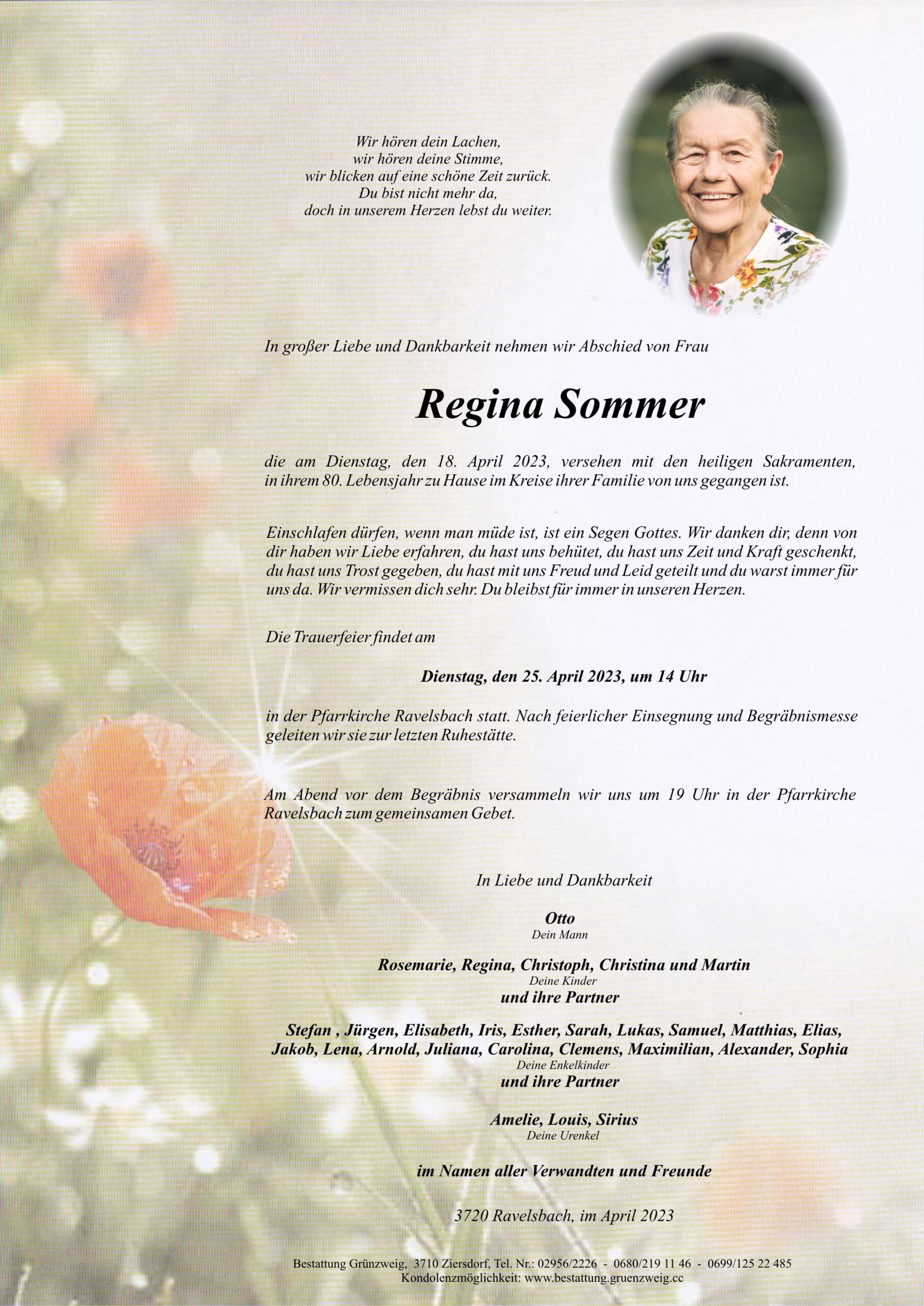 Meine innigste Anteilnahme entbieten Familie Alois Leitgeb, 3714 Frauendorf. Ich ging mit Regina in Ravelsbach zur Schule,