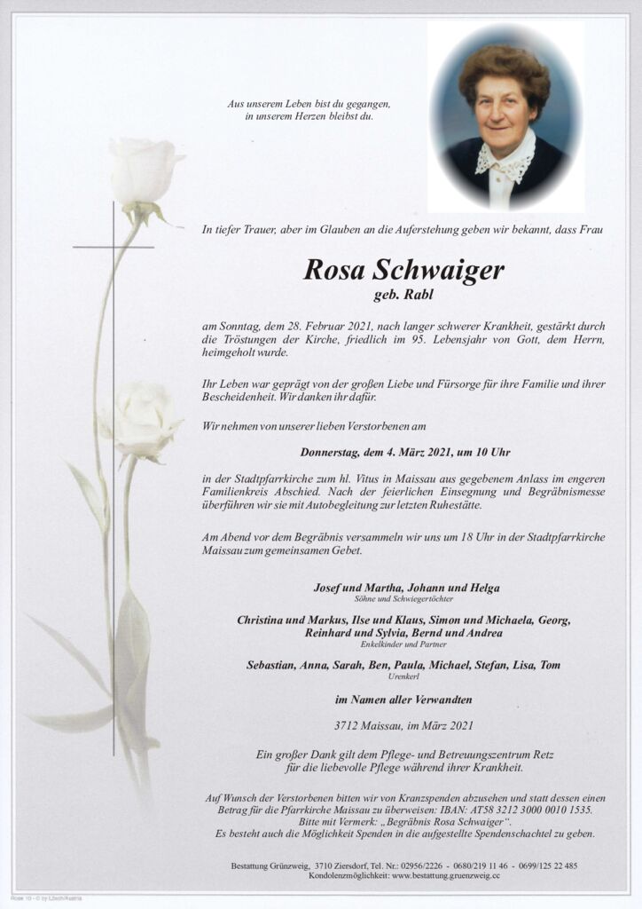 Werte Trauerfamilie unsere innigste Anteilnahme am schweren Verlust von Frau Rosa Schwaiger entbietet Otto Thiemer u.Helga Partl.