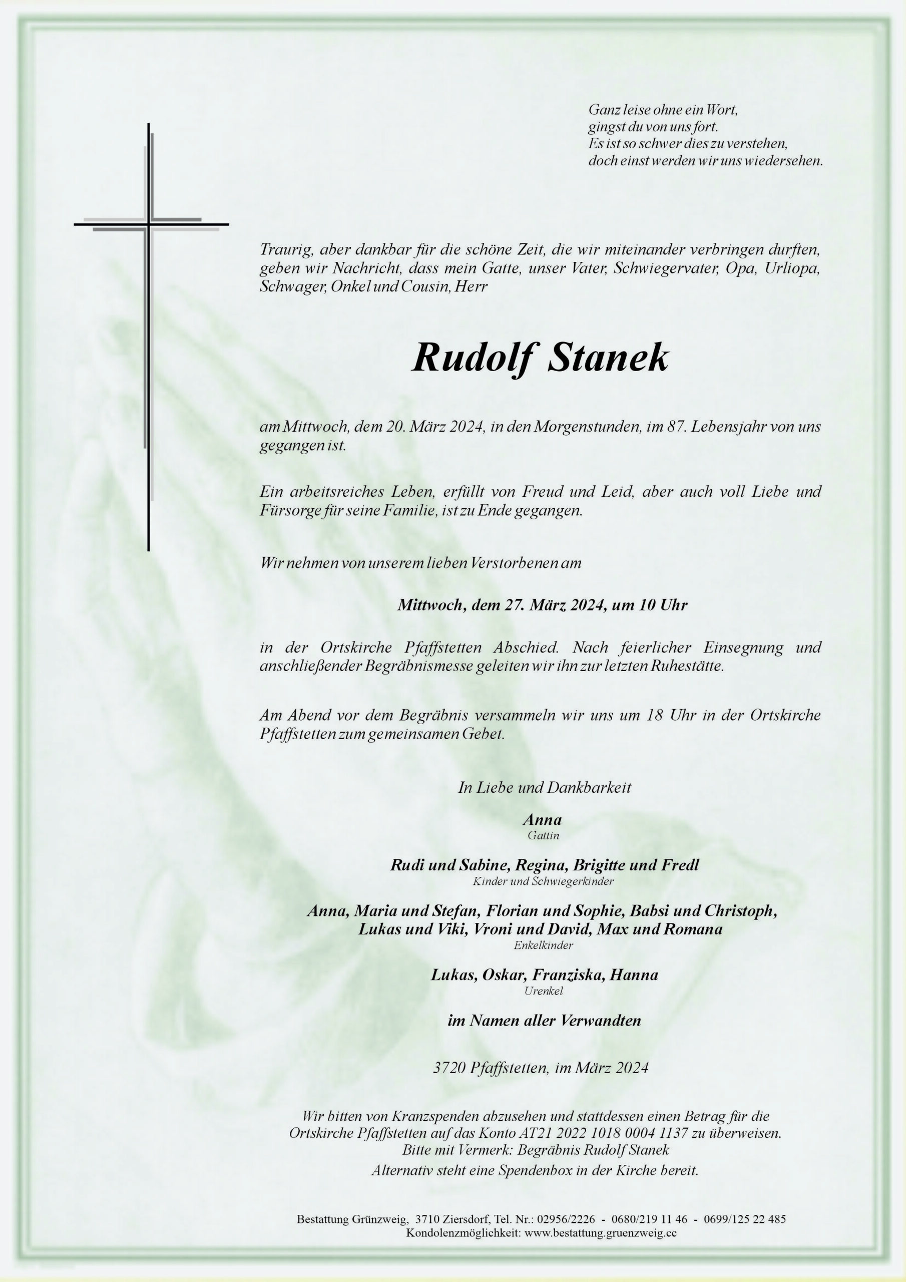 Liebe Familie Stanek unsere aufrichtige Anteilnahme, Gottfried Wodak und Familie.
